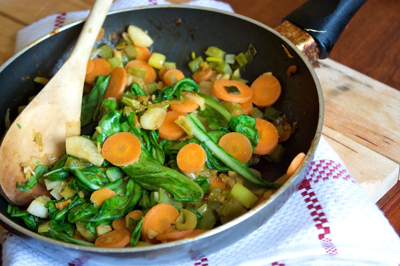 Sauteed veggies before I started rolling: green onions, pepper, carrots, Japanese beets, and pak choi
