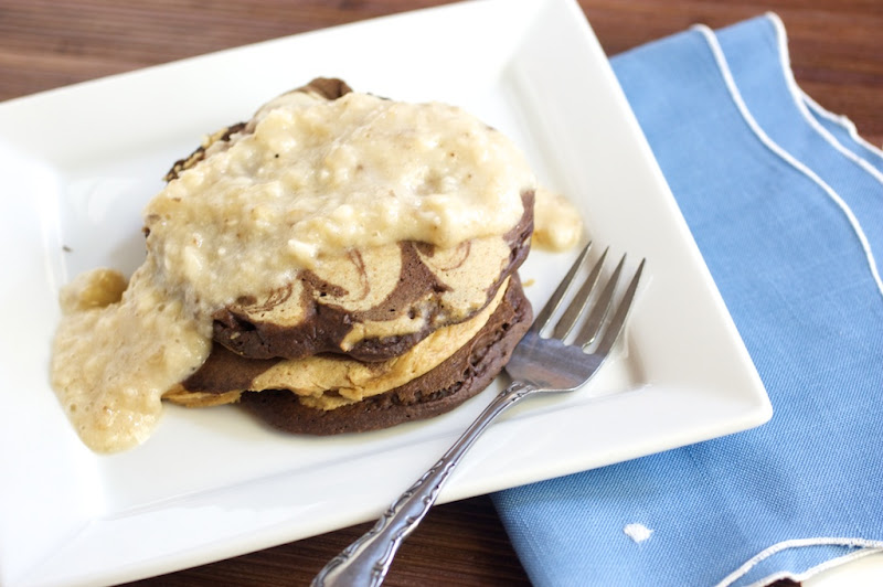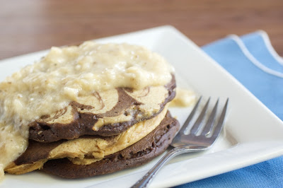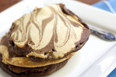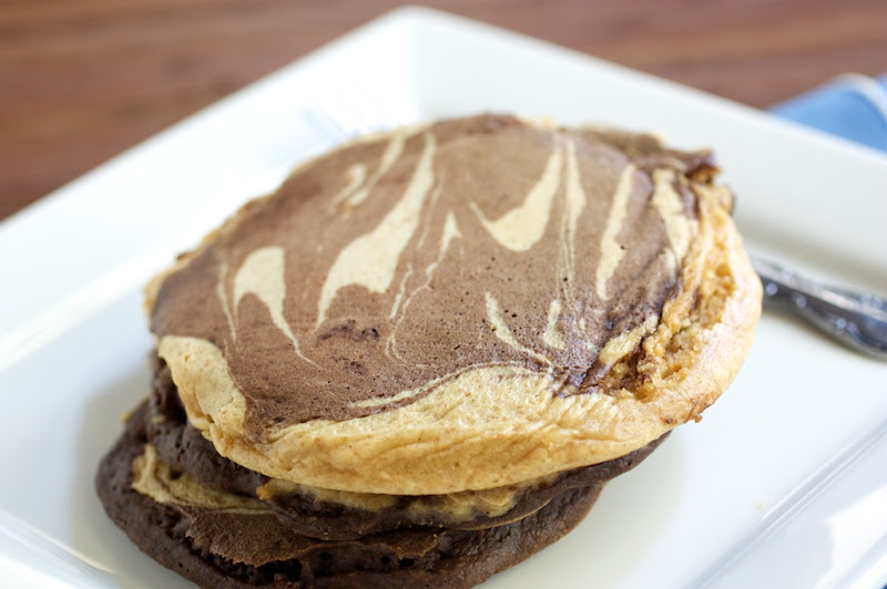 - Heat a skillet over medium heat. Scoop about a fourth of the chocolate batter and smooth out to a circle. Take the peanut butter batter and drizzle two lines across the chocolate pancake. With a knife, swirl the peanut butter into the chocolate part of the pancake. Continue, reversing every other pancake (so you will also have peanut butter pancakes with a chocolate swirl.) Cook on one side until little bubbles form on the surface. Flip the pancake and continue to cook until pancake is done.
