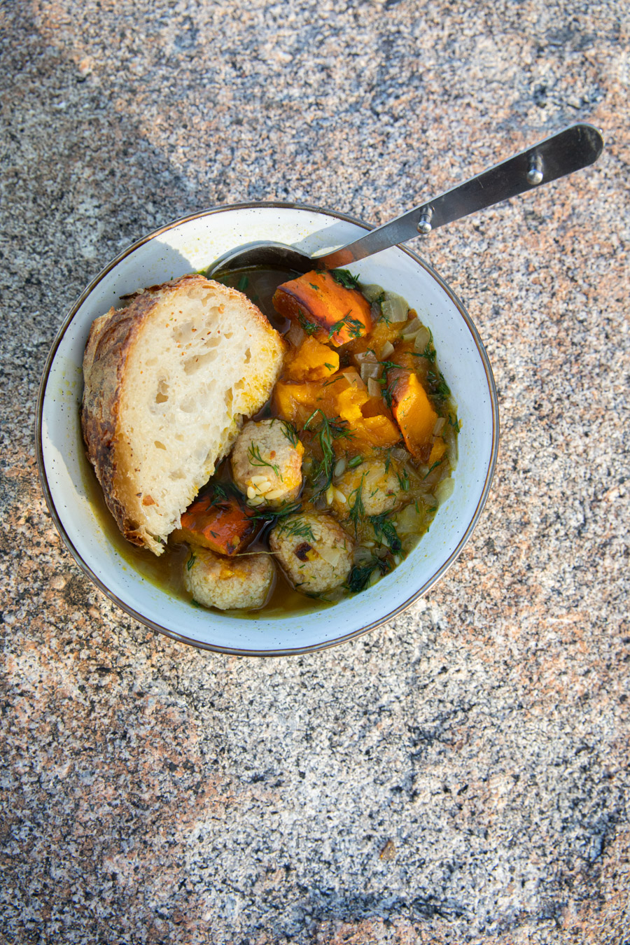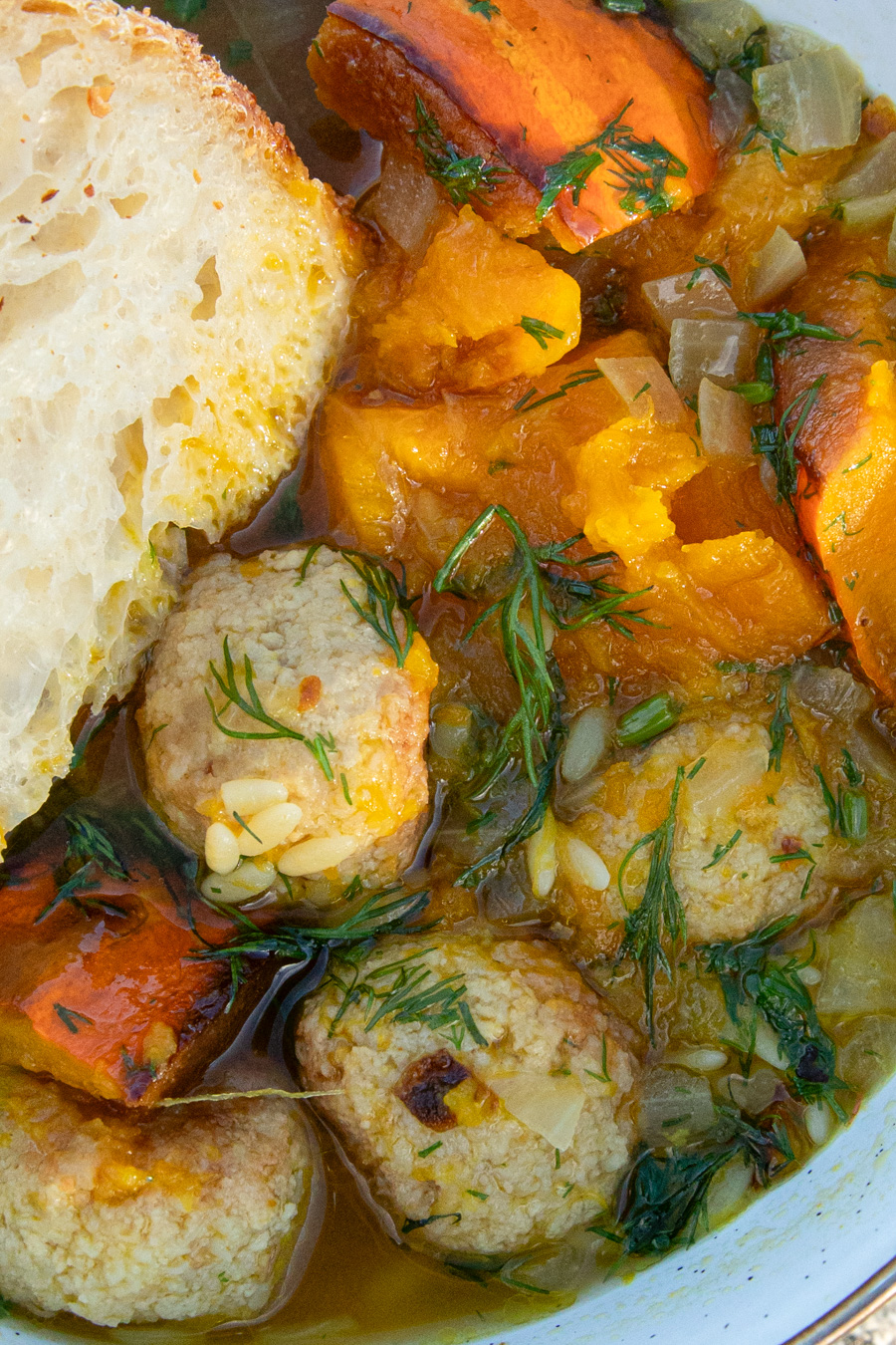 This cozy, brothy soup is a culmination of pairing leftover tofu meatballs with some simple roasted red kuri squash. Prepping the meatballs and squash ahead of time makes quick work and really is a base for adding more flavors such as different herbs/spices, chile, or a different broth base.